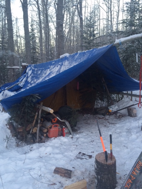 Ken Boon, an amazing individual who lives in the Valley and who has long since been opposing the Site C dam met us at the top with his skidoo and brought our load of gear in. They set up the camp within the previous month and that day (December 31st) they had a small shack that had been insulated flown in via helicopter.