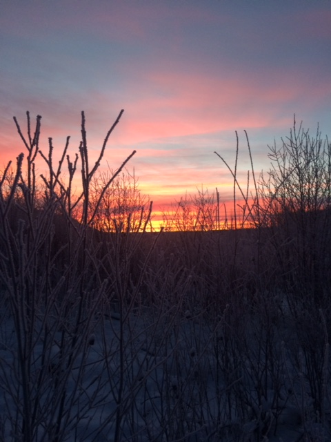 In the morning, while the sun was rising I walked down to the water, there was a frozen inlet between us and the Peace River, which never freezes because of the two Hydro Dams that already exist on it. I stood on the ice, with willows and sparse brush surrounding me, and watched the sun rise and prayed. There is no beauty, no peace like that. Get it? Peace.. because we were on the Peace River.