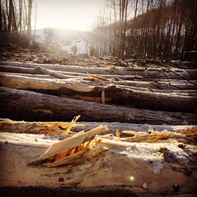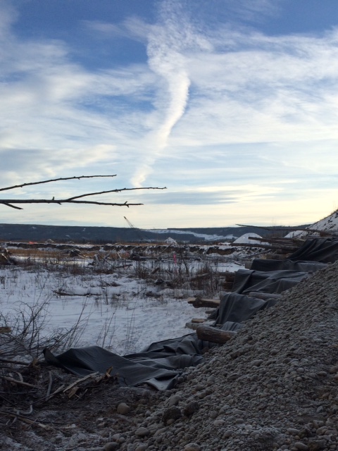 We had just left where BC Hydro started to clear on the West side of the Moberly River. We walked over to the crude bridge that they had built to cross the frozen river with their equipment. I had to see it up close for my own eyes and I had to lay an offering of tobacco for the land, for its suffering and loss.