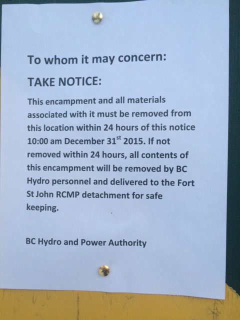 When we arrived to camp we found new no trespassing signs (not ours) posted on trees and an eviction notice posted by hydro on to the shack. Apparently we had twenty four hours before forced removal would happen. It was just a big scare tactic from a corporate bully.notice